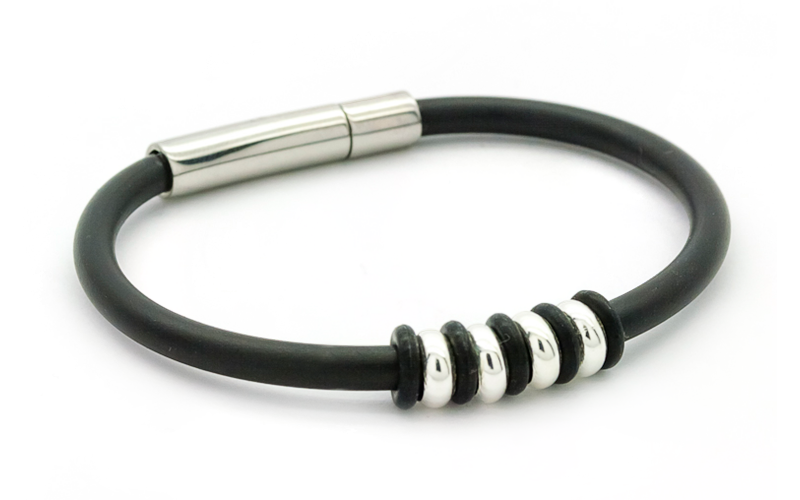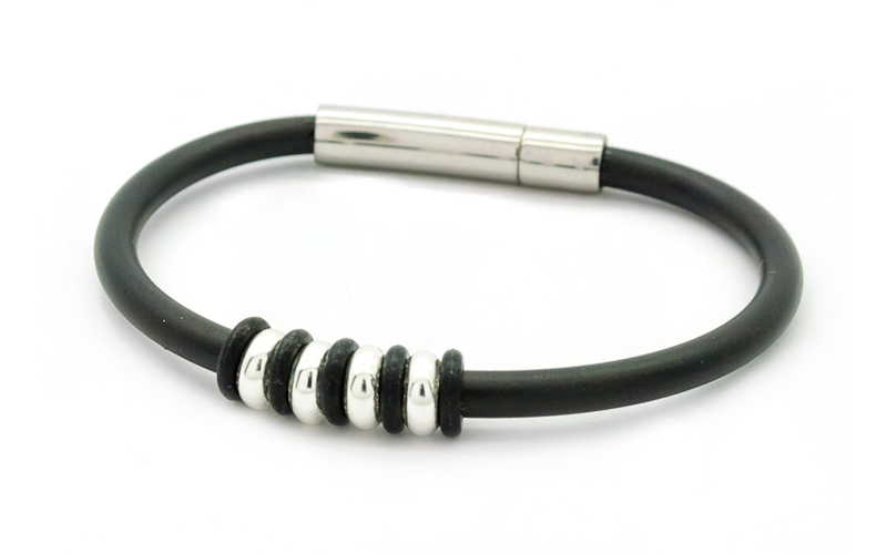 La polsera Black-Cat Silver forma la senyera mitjançant la combinació de gomes negres i anelles de plata.