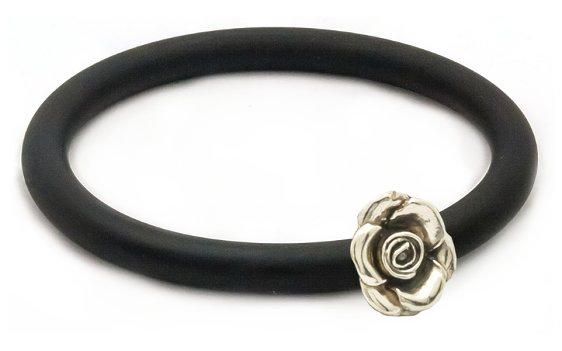 La rosa eterna de Sant Jordi: polsera autoajustable de cautxú amb rosa de plata de llei. Digues "t'estimo" amb una joia que perdurarà sempre.